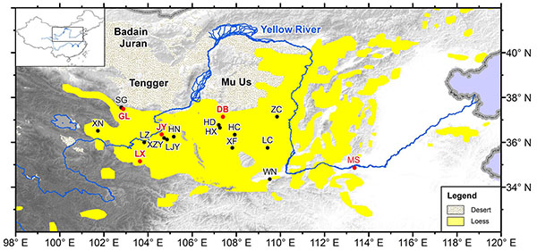 中国黄土高原西部和北部的黄土沉积,沉积速率高、成壤作用弱,具有记录轨道-千年尺度季风变化的独特优势。中国科学院地球环境研究所孙有斌研究员团队在黄土高原选取了5个高沉积速率的黄土记录,包括黄土高原西部古浪、靖远和临夏的黄土岩心,北部的定边及东南部的邙山黄土剖面(图1),通过获取高分辨率的粒度和磁化率变化序列,探讨了东亚季风在轨道和千年时间尺度上的变化特征和机理。