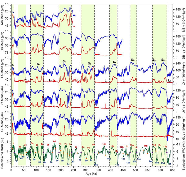由于受沉积速率和风化成壤的不同影响,磁化率变化幅度和频率在空间上存在一定差异。来自黄土高原中部的磁化率记录表现出显著的冰期-间冰期波动,在古土壤S5-1 (相当于MIS13)显著增加。然而,在黄土高原西部,高沉积速率黄土序列的磁化率记录在间冰期古土壤层内显示出显著的岁差波动,磁化率显著增加出现在S4或S3。