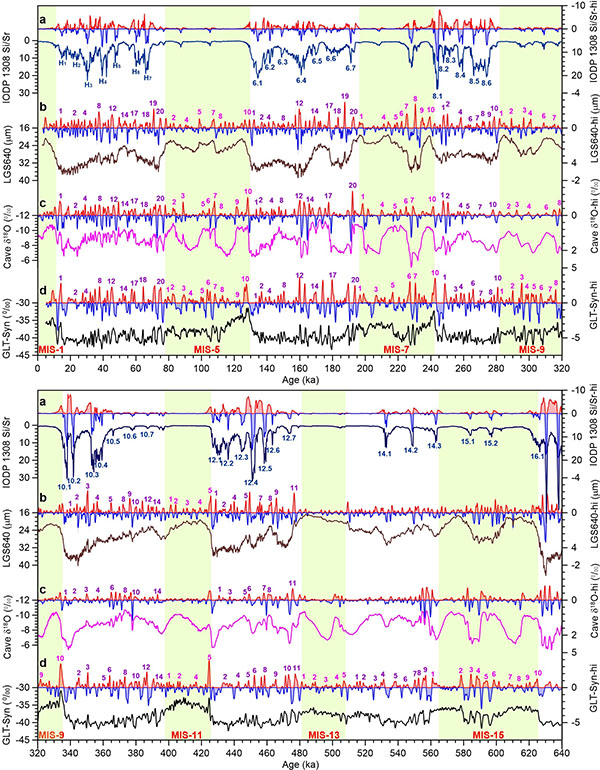 将黄土和石笋代用指标的高频组分(<9 kyr)与北大西洋和冰芯记录进行比(图3),发现冰期时段千年尺度突变事件是持续存在、空间可比的;但在间冰期时段,各记录显示的气候突变事件强度和数量差异较大,表明在不同冰期和间冰期边界条件下,气候突变的驱动力可能存在差异。