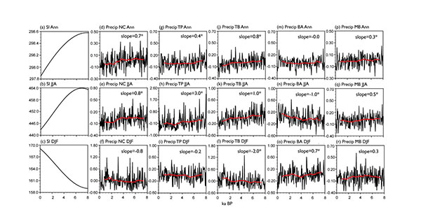 图1:过去8千年北半球日射和季风区以及中亚干旱区降水的年变化以及夏季和冬季变化:(a-c)太阳日射;(d-f)中国北方区域降水;(g-i)图兰平原降水;(j-l)塔里木盆地降水;(m-o)巴尔哈什-阿尔泰降水;(p-r)蒙古-贝加尔湖降水。