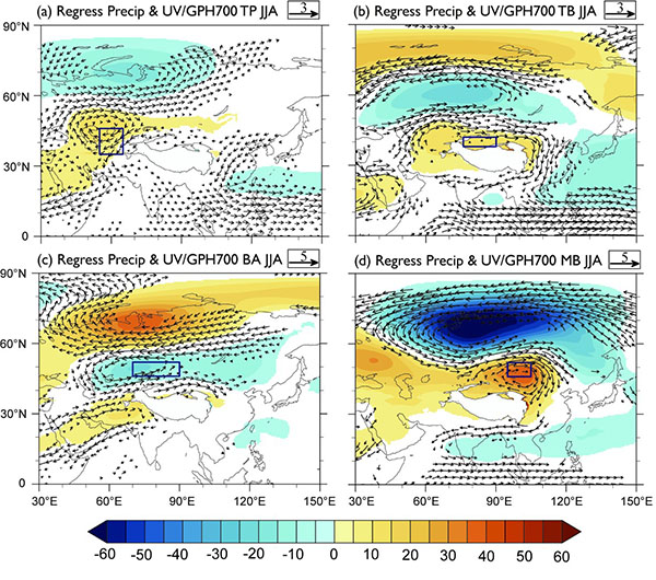 图2:四个中亚干旱区夏季降水回归的700hPa风场和位势高度场。
