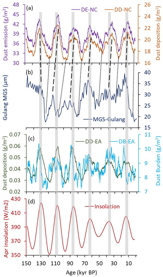 图1 过去15万年沙尘活动序列。(a)模式输出中国北方春季沙尘排放(DE-NC)、沉降通量(DD-NC);(b)黄土高原古浪剖面平均粒径(MGS);(c)模式输出东亚区域春季沙尘沉降通量(DD-EA)和柱含量(DB-EA);(d)四月45°N太阳辐射。