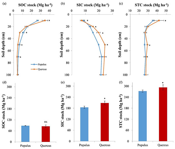 1. 阐明了黄土高原山杨林向辽东栎林演替中土壤碳库组成演化特征。(1)辽东栎林表层土壤有机碳库大于山杨林,但下层土壤有机碳库小于山杨林;(2)土壤无机碳库与有机碳库在剖面上呈相反规律;(3)辽东栎林土壤总碳库储量显著高于山杨林,该差异主要由无机碳库差异引起。