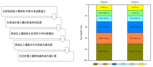 图4 历史时期土壤侵蚀碳库流失量计算流程及两种林分土壤分层年龄范围