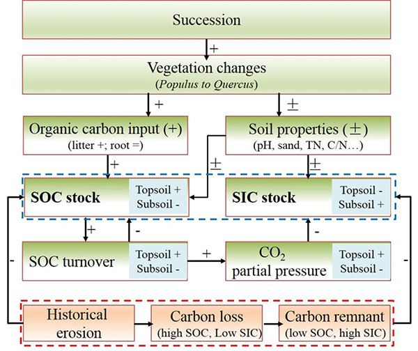 在上述研究基础上,总结了黄土高原典型森林演替中土壤碳库过程的驱动机制。发现山杨林向辽东栎林演替中凋落物生物量增加促进了表层SOC的积累,可用碳源的增加支持了更多土壤微生物,进而提高表层SOC周转速率。相比之下,辽东栎林下层SOC的下降可能归因于强烈的历史侵蚀和土壤激发效应。另一方面,SOC的增加提升了土壤CO2分压,促进表土中碳酸盐的溶解和浸出,并导致SIC降低。相反,降低的SOC会降低CO2分压,这有利于下层土壤SIC的增加。