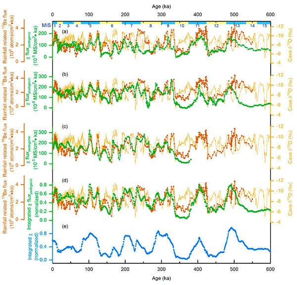 图1. 过去60万年洛川(a,绿)、灵台(b,绿)及宝鸡(c,绿)黄土剖面及其综合磁化率通量(d,绿)记录与中国石笋δ18O(黄)、宝鸡降水(红)及黄土磁化率(e)对比