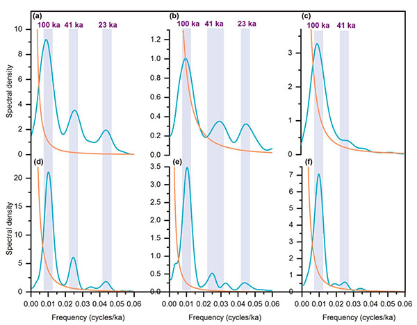 图2. 深海氧同位素(a-350 ka, d-600 ka)、黄土磁化率通量(b-350 ka, e-600 ka)及磁化率(c-350 ka, f-600 ka)频谱分析