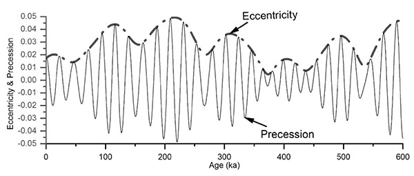 图3. 地球轨道偏心率(粗虚线)与其调制的岁差(实线)参数对比