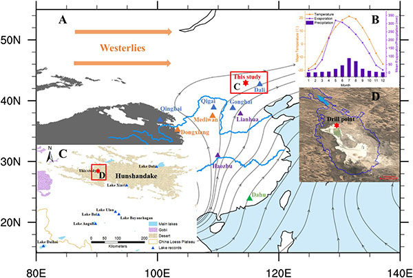 图1. 研究点的地质背景(红色实心星号表示研究点巴彦淖尔湖位置,43°07′N, 114°30′E, 1070 m)。(A)1971至2010年东亚季风区夏季850 hPa平均气压场;(B)研究区锡林浩特气象站1971至2000年气象观测数据;(C)浑善达克沙地地质背景;(D)研究点巴彦淖尔湖卫星影像照片。