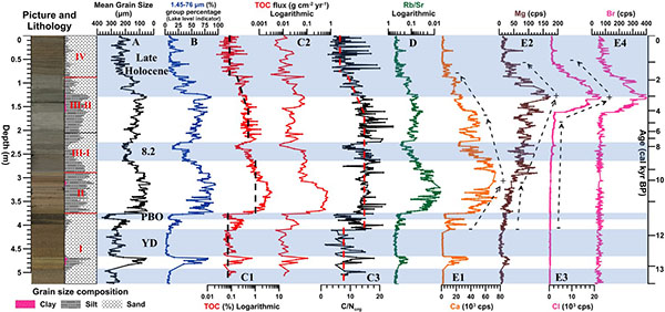 湖泊-风成砂交互序列清晰的展示了晚更新世-早全新世气候转型期数次气候冷暖/干湿波动。高分辨率年代测定表明,这些波动分别对应于北大西洋Allerod,Younger Dryas,pre-Boreal oscillation和8.2 千年气候波动事件。其中,该记录清晰的展示了北大西洋Younger Dryas事件结束后,全新世伊始一次显著的气候极端干冷事件(约11.5-11.3千年, 386-375厘米深度粗砂层),年代对应于北大西洋pre-Boreal oscillation气候突变事件。