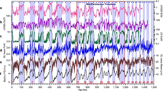 本研究整合了来自海洋和陆地对气候突变敏感的高分辨率元素地球化学记录,构建了一个更新世千年尺度气候变化代表性序列,发现千年尺度气候突变事件的变幅不仅受冰期-间冰期下垫面的强烈调制,而且也受到岁差和倾角变化的持续影响,为评估轨道-千年尺度气候变化之间的动力关联提供了关键地质证据。