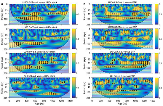 四种元素比值千年变率的频谱结果表明,突变事件幅度在10万 、4万和2万年频段表现出明显的周期性。千年气候变率与冰量和轨道参数变化的小波相干谱图,揭示出在10万和4万年周期上千年尺度变率明显受到冰量变化调制,尤其在中更新世气候转型之后;在4万和2万年频段上千年尺度气候变幅持续受到斜率和岁差影响(图3)。