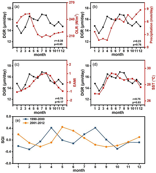 近期中国科学院地球环境研究所晏宏研究员团队利用激光共聚焦显微镜(LSCM)获得了南海南部现代砗磲(MD3)壳体的天生长速率(DGR)记录,并建立了一个23.7年精确的天分辨率年代学框架。研究表明在季节尺度上,DGR与海表面温度呈显著正相关。3月至8月是砗磲MD3的主要生长季节,此时阳光充足,海温温暖。而9月至12月降水增加以及12月至次年3月海表面温度(SST)减小阻碍了秋冬季节砗磲的生长。在年际尺度上,砗磲DGR的变化具有显著的2-3年和4-5年的周期特征,这可能分表代表了TBO(Tropospheric Biennial Oscillation )和ENSO(El Nino-Southern Oscillation)活动的影响。因此,砗磲的天生长纹层能够用于建立超高分辨率的年代学记录,其多尺度特征有可能记录天-年际时间尺度的气候变化。