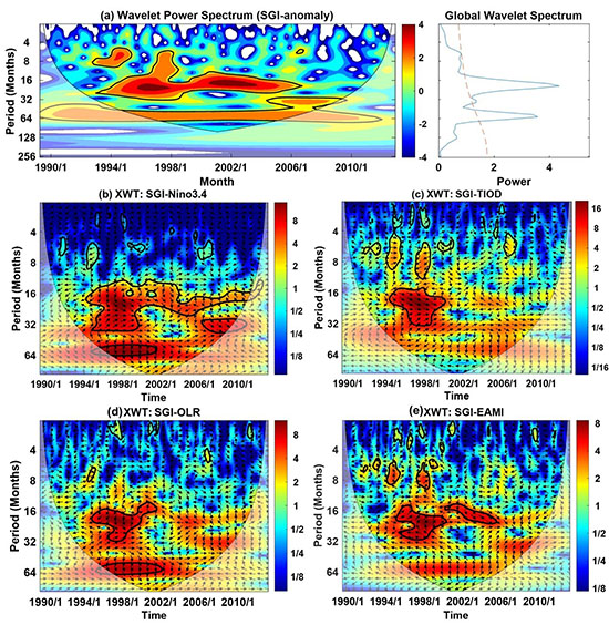 图2 月分辨率砗磲生长速率与气候变量的小波分析结果