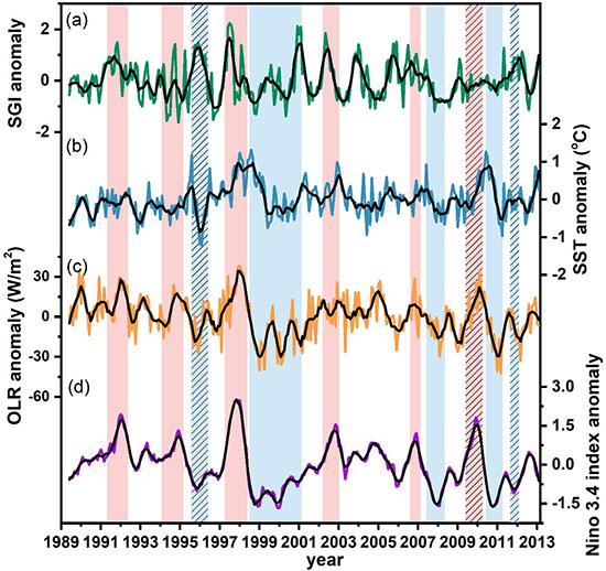 图3 砗磲生长速率与气候变量的对比,粉色(蓝色)代表厄尔尼诺(拉尼娜)事件。