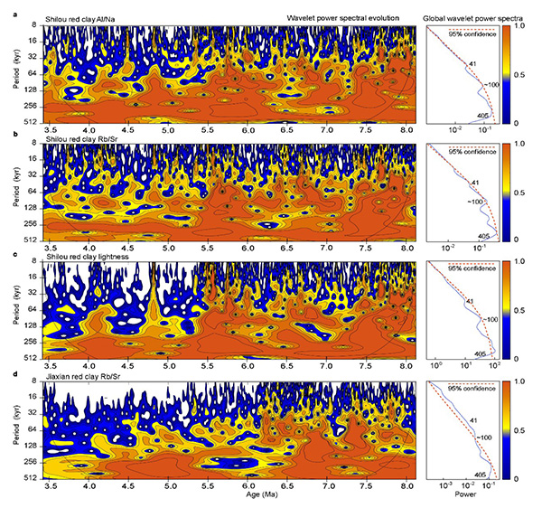 黄土高原东部石楼红粘土剖面发育了清晰的强(红色或深红色)弱(浅红色)古土壤旋回(图1)。研究团队通过高分辨率(~1–2千年)Rb/Sr、Al/Na和亮度记录重建了距今800–340万年前东亚夏季风降雨的轨道周期变化特征。结果显示,东亚夏季风降雨在晚中新世至中上新世具有显著的40万年和10万年周期(图2),与地球轨道的偏心率周期一致,而与该时期南极冰盖波动的4万年周期不同。根据地球气候的轨道驱动理论,偏心率调制的太阳辐射振幅变化可通过调解温度波动,进而驱动季风降雨呈40万年和10万年周期变化。