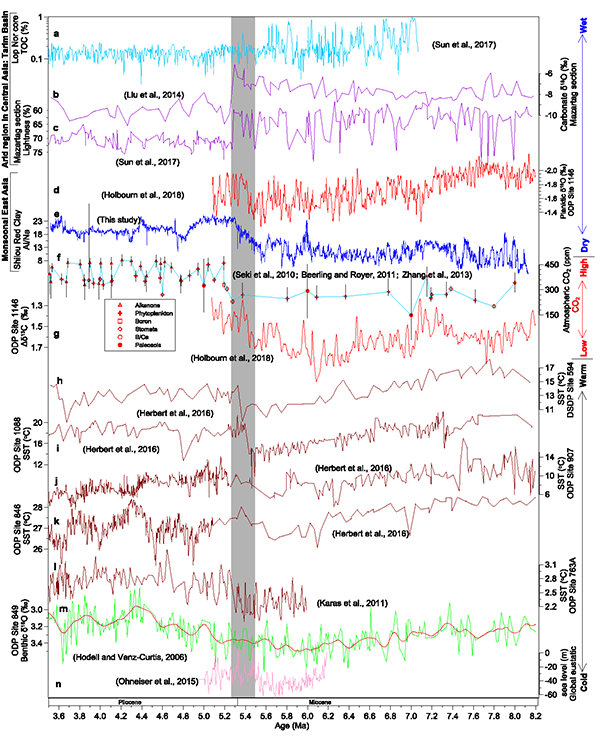 图3亚洲季风区和内陆干旱区气候在中新世-上新世转型过程中的不对称演化与全球变暖