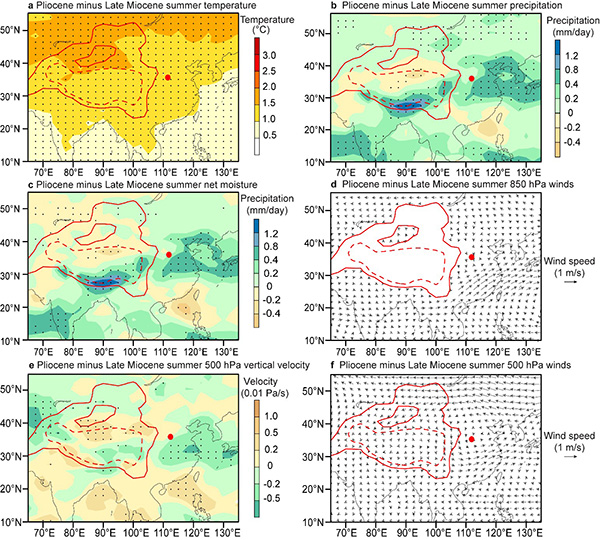 除了轨道尺度气候变化外,该研究还通过综合亚洲东西部的古气候记录揭示出亚洲季风区和内陆干旱区气候在中新世-上新世转型过程中呈不对称演化:东部季风湿润区变湿,内陆干旱区变干(图3)。海陆对比(图3)和气候模拟(图4)进一步表明,这一不对称演化是由中新世-上新世转型过程中的气候变暖引起的。