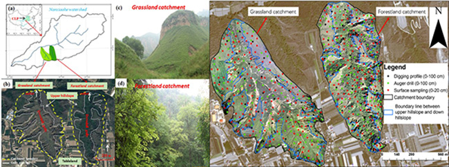 基于上述科学问题,中国科学院地球环境研究所金钊研究员团队选择甘肃西峰南小河沟观测场的植被自然恢复(董庄沟)和人工植树造林(杨家沟)小流域为研究对象,探讨和植被自然恢复小流域相比,人工植树造林小流域土壤pH的变化。本研究采用空间K均值布点的方法,每条小流域设置280个取样点,其中0-100 cm深度取样点100个,0-20 cm表层土壤取样点150个,0-100 cm土壤剖面30个(图1)。