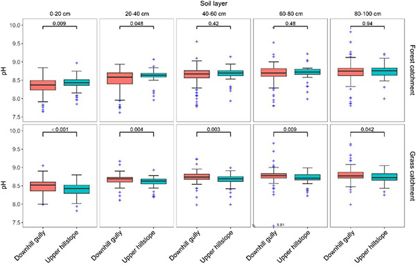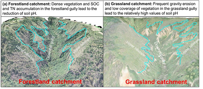研究结果表明,长期植树造林(1954年至今)显著降低了下坡沟谷的土壤pH(0-80 cm深度),降低范围为-0.02--0.15个单位(图2)。在上部坡面,植树造林对土壤pH无显著影响。在植树造林小流域,沟谷坡面土壤pH降低与土壤全氮和有机碳含量呈显著的线性负相关关系。此外,流域微地形对土壤pH有显著影响。在植树造林流域,下部沟谷土壤pH显著低于上部坡面,而自然恢复小流域正好相反(图3)。植树造林小流域下部沟谷密集分布的森林和林下植被,使得养分物质聚集,土壤酸化作用更为显著,从而使得植树造林流域下部沟谷土壤pH低于上部坡面;而植被自然恢复小流域下部沟谷频繁发生的重力侵蚀为坡面带来新鲜的碱性黄土物质,使得下部沟谷土壤pH高于上部剖面(图4)。上述研究结果为深入理解植树造林和微地形对流域土壤pH的影响及相关的地球关键带过程提供了新认识。