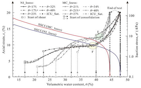 图2原状NI和压实MC黄土在不同初始含水率下沿CSU应力路径的轴向应变(εa)随体积含水率(θ)的变化曲线(其中椭圆E、F表征临界流态区)