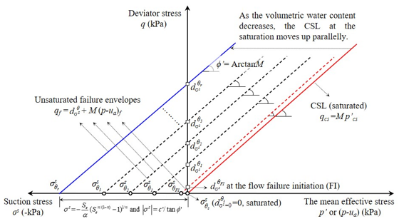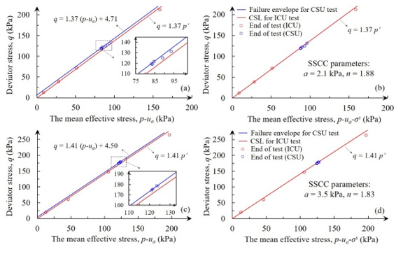 针对上述科学问题,中国科学院地球环境研究所金钊研究员团队冯立博士,从固沟保塬回填沟头改变局部水文条件入手(图1), 在考虑到两种相互关联的斜坡破坏机制,即:① 饱和黄土在单调增加荷载应力路径(ICU)下的静态液化机制和 ② 非饱和黄土增湿过程中在恒定荷载应力路径(CSU)下的流态破坏机制的基础上,分别针对原状黄土和机械压实黄土开展了上述两种应力路径下的三轴测试对比实验,揭示了两类黄土在变饱和状态下的水-力运动轨迹(图2),提出了非饱和土框架下黄土静态液化萌生的临界流态化准则,明确了饱和静态液化和非饱和临界流态化之间的联系与区别,扩展了静态液化在全吸力范围内的适用性,并从临界强度包线的存在性、吸应力值的近似相等性、孔隙配置的变异性以及修正后CSL的唯一性(图3)等四个方面验证了提出的临界流态化的有效性和物理正确性。