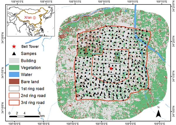 作为西北地区第一大城市,西安市的城市化进程在中国具有典型性。中国科学院地球环境研究所王云强研究员团队以西安市为对象,通过高密度网格布点(1018个),采集主城区(三环以内)表层土壤(0–20 cm),利用经典统计、地统计、主成分分析、最小数据集等方法,分析西安市表层土壤有机碳库空间变异特征、分布规律和主控因子,并比较不同空间预测方法对城市土壤有机碳密度的预测效果。