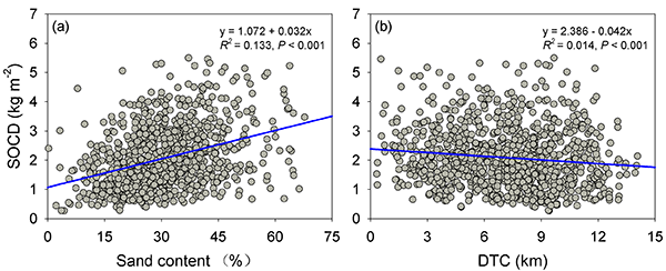 图2 土壤有机碳密度与土壤砂砾含量(a)和距市中心距离(b)的关系