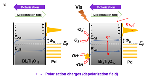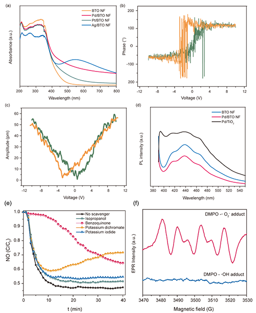 图3 Pd-Bi4Ti3O12纳米片复合结构的光学吸收、压电性能、电荷分离及产生的主要活性氧物种