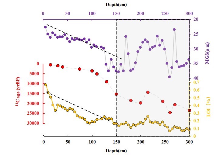 图1 烧失量(LOI)和中值粒径(MGS)与黄土有机质14C年龄的比较。虚线代表逐渐变湿的气候;阴影区代表在150cm到300cm深度,年轻/年老的14C年龄的波动伴MGS和LOI的变化。