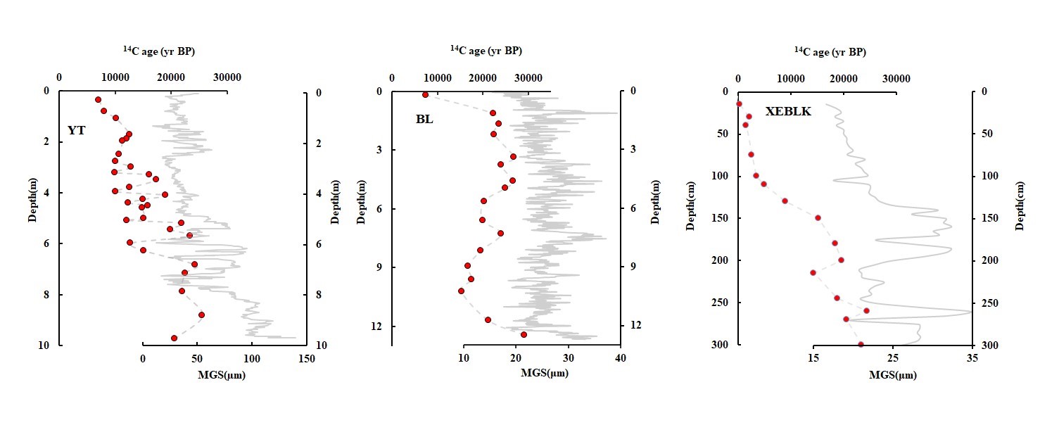 图2 YT剖面(Shu et al.,2018)、BL剖面(Sun et al.,2018)和XEBLK剖面(本研究)的中值粒径(MGS)与有机质14C年龄的比较。