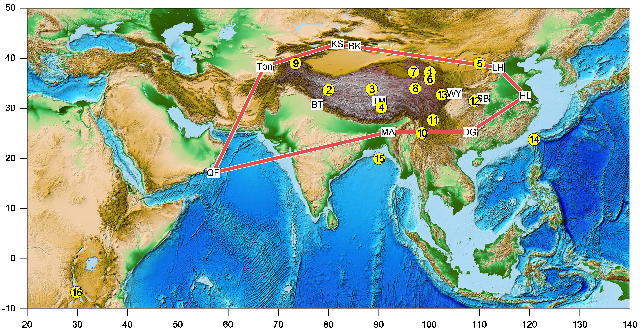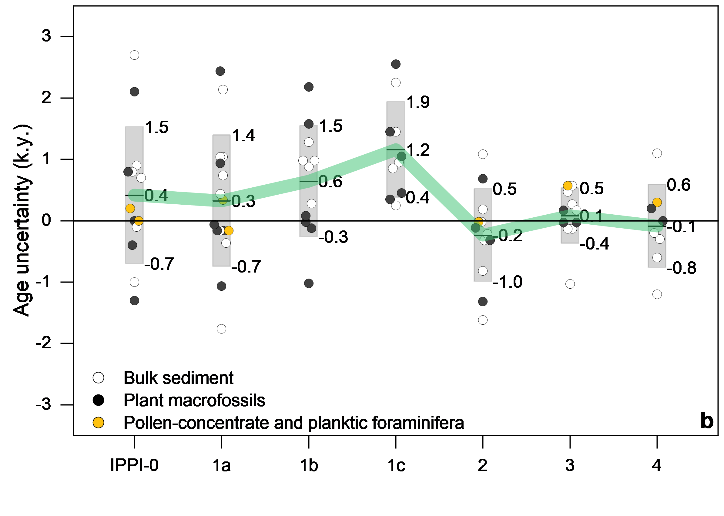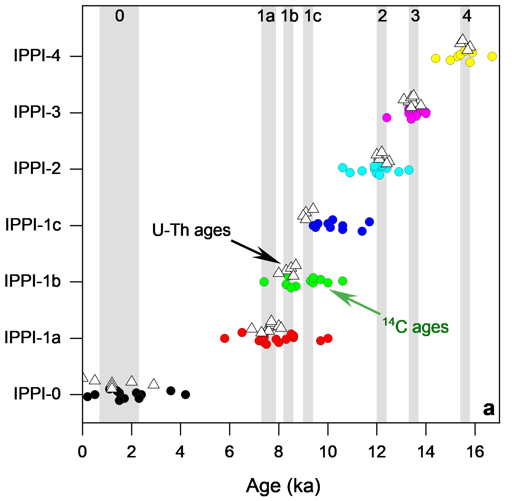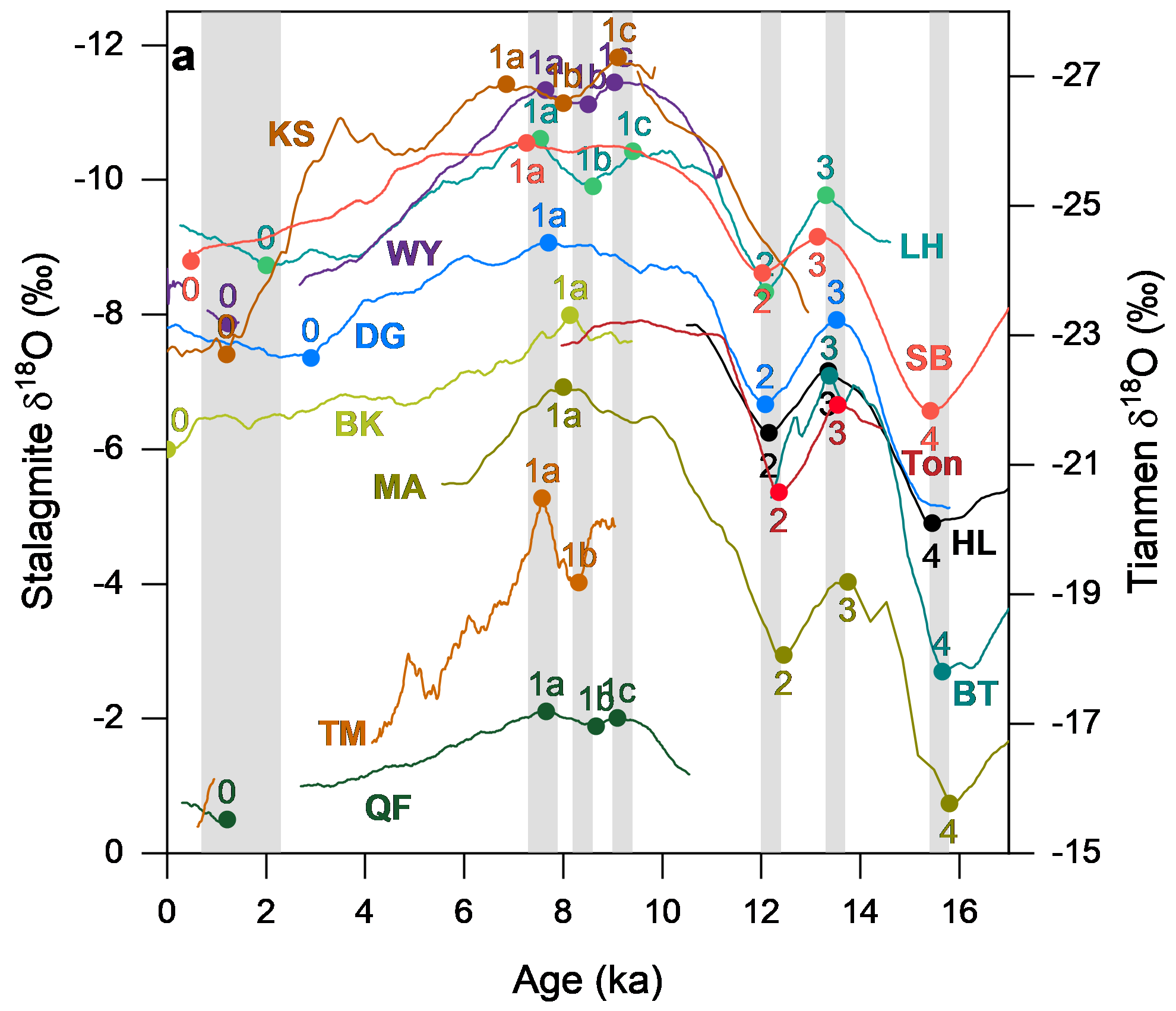 研究团队首先分析了已发表的亚洲石笋氧同位素记录,确认末次冰消期以来的典型事件中极值点的出现时间非常接近,可以为作为降水同位素同步点使用(图2)。研究团队又分析了16个湖泊、泥碳和海洋的叶蜡氢同位素记录,并认为沉积序列中降水同位素同步点的14C年代可以和U-Th年代相对比。对比结果显示,同步点14C年代的离散程度明显大于U-Th年代,早全新世同步点的14C年代老于U-Th年代,而在冰消期中则相近(图2)。14C年代的离散度大且偏离度不等的现象,主要代表了固定碳库校正导致的年代不确定性。