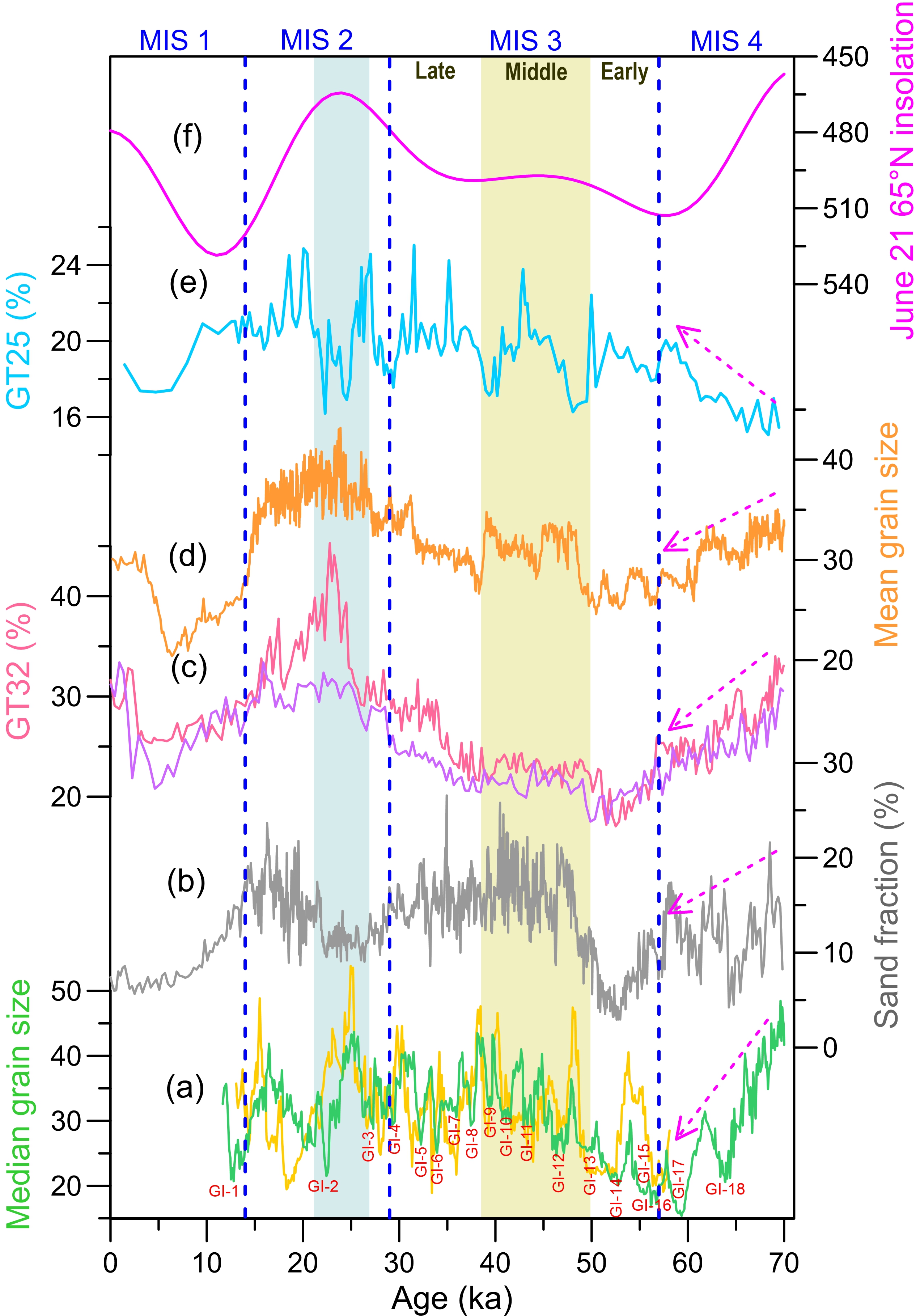 图1 末次冰期以来中亚北部(a,b)和南部(e)粉尘风动力指标与中国黄土高原(CLP) (c, d)以及北纬 65°N的夏季太阳辐射对比