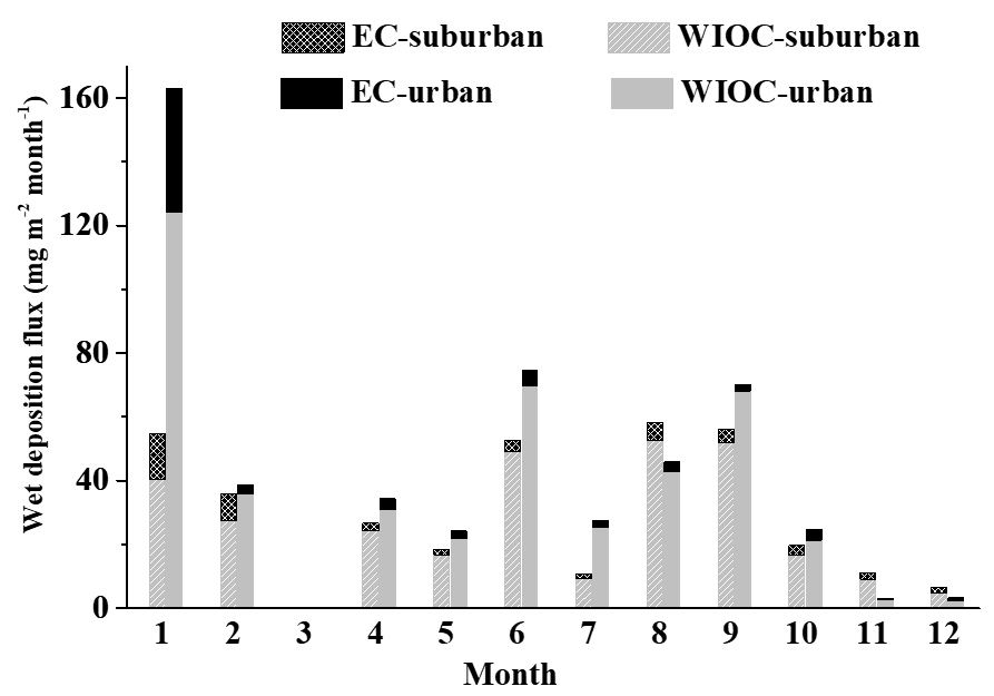 图1 西安城区和郊区水不溶性有机碳(WIOC)和元素碳(EC)湿沉降通量的逐月变化.