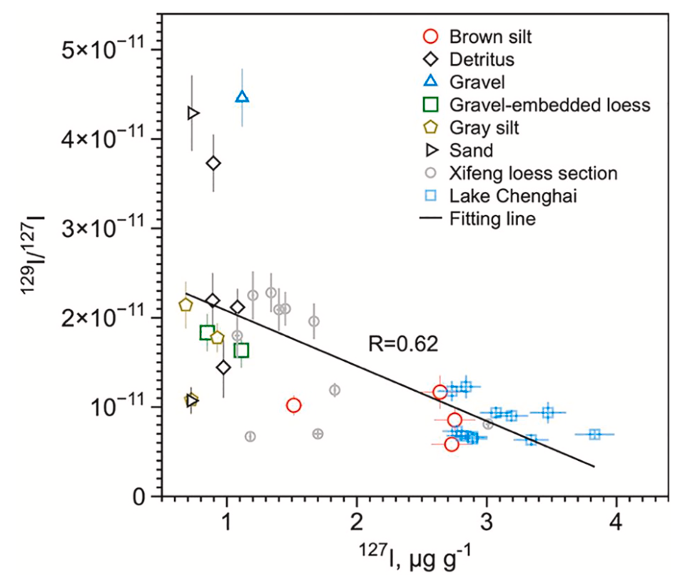 地球环境研究所范煜坤副研究员等开展了青藏高原雪水河阶地(全新世以来)以及程海湖(近200年以来)等沉积物中的碘同位素分析工作,旨在进一步认知内陆环境碘同位素的地球化学行为特征。该工作首次获得了河湖等沉积物中的天然129I/127I比值,发现了具有比黄土沉积更宽的分布范围(0.58-1.23) ×10-11(图1和图2);同时,发现129I/127I比值与碘含量存在大致的反相关关系(图3)。结合沉积物岩性以及物源地层形成年龄分析,认为该变化规律可能指示了人工碘和环境中“老碘”的混合效应,(0.94-1.23)×10-11可能是河湖沉积物中达到稳态的天然129I/127I比值。该数值在陆相沉积中是否具有时空普遍性以及该范围的精确度仍需进一步工作予以验证和限定。