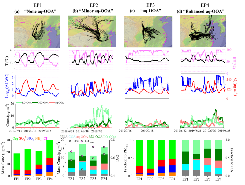 研究结果显示,SOA(低氧化性二次有机气溶胶(LO-OOA)+ 高氧化性二次有机气溶胶(MO-OOA)+液相氧化生成二次有机气溶胶(aq-OOA))对夏季OA的平均贡献为69%,对NR-PM2.5的贡献为43%,表明SOA对西安夏季气溶胶的重要贡献。对比分析雨雾期与非雨雾期SOA的生成差异发现,西安夏季SOA生成以光化学氧化途径为主,主要促进LO-OOA以及MO-OOA的生成;但在雨雾期液相化学贡献显著增加,aq-OOA在OA总浓度中的占比从非雨雾期的2%升高至雨雾期的19%(图1)。进一步的特征事件对比分析结果显示,持续的高湿度环境是aq-OOA生成的决定性因素,在此基础上,高Ox环境进一步促进其生成;同时来自东南方向气团传输有利于形成持续的高湿度雨雾天气,促进aq-OOA生成(图2)。