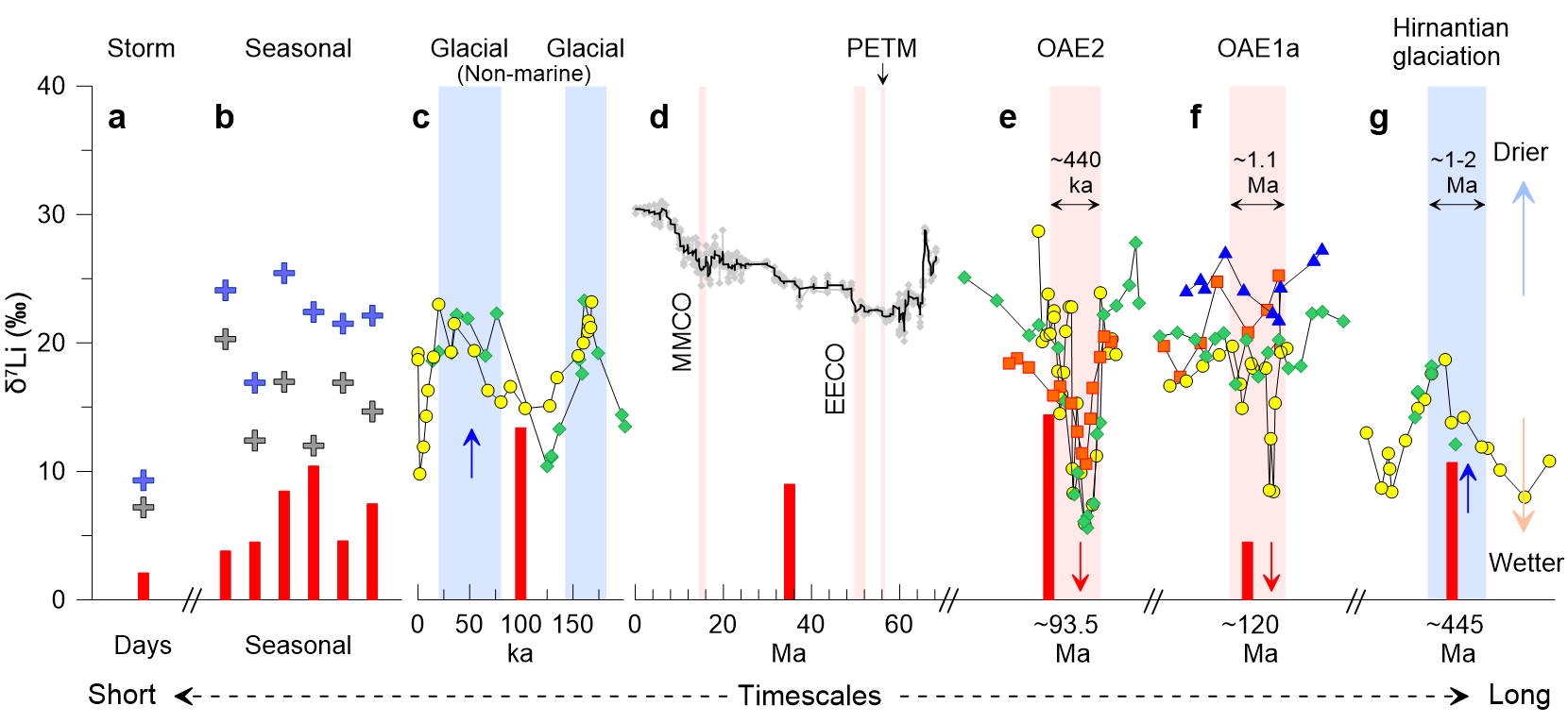 晚新生代以来全球气候变冷到底是受“气候反馈”还是“构造抬升”控制一直是地球科学研究的前沿热点之一,存在不同观点和激烈争论,大量论文发表在Nature和Science上。其争论的根源在于,到底是什么机制主导着大气CO2浓度的变化?作为调控长时间尺度大气CO2变化的核心机制,硅酸盐岩风化又是争论根源的焦点,而如何有效示踪硅酸盐岩风化又是焦点中的焦点。2012年,Misra 和 Froelich在Science发表了6800万年以来海水Li同位素(δ7Li)的变化曲线,提出海水δ7Li值可以反映造山带风化,并认为新生代以来海水δ7Li值9‰的增加是构造抬升导致风化增强的结果。该文的发表掀起了Li同位素示踪大陆风化的浪潮,再次刺激了“构造-风化-气候”内在联系的新一轮争议。那么,海水的δ7Li是否能有效示踪硅酸盐岩风化呢?其主导的控制因素到底是什么?