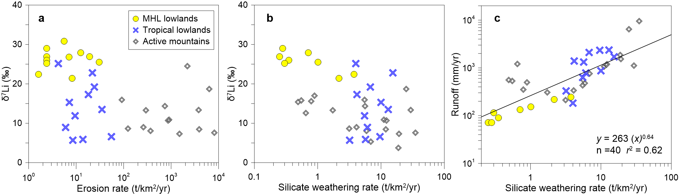 进一步空间大尺度对比也显示同样结果:中高纬平坦低地河流具有普遍低的径流及高的δ7Li值,而热带低地及活跃造山带河流具有高的径流及低的δ7Li值。