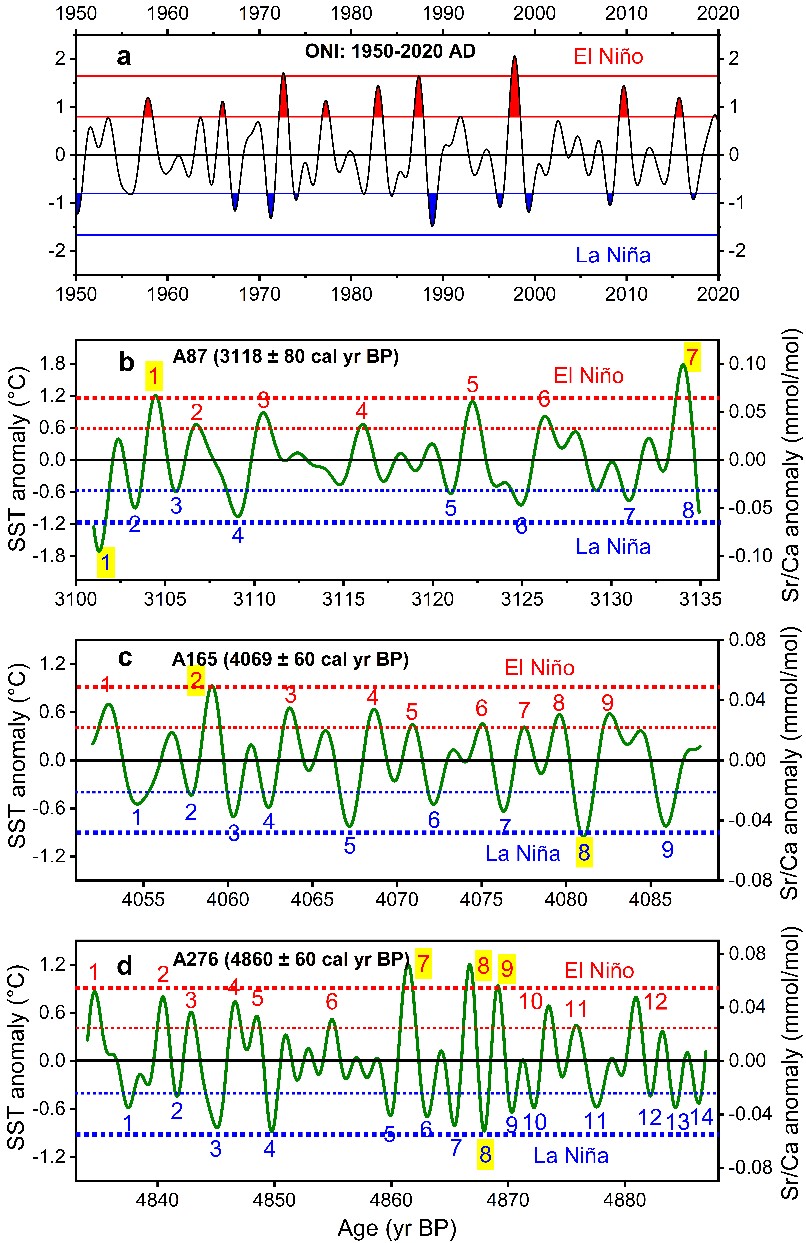 近期,中国科学院地球环境研究所晏宏研究员团队,对来自南海北部的三个亚化石鳞砗磲A87(3101-3135 yr B.P.)、A165(4052-4088 yr B.P.)和A276(4834-4887 yr B.P.)壳体进行了高分辨率的Sr/Ca分析,重建了中晚全新世三个时段的ENSO活动。重建结果表明,5000~3000 yr B.P.期间三个时段的ENSO活动频率要高于现代(AD 1950-2020)。