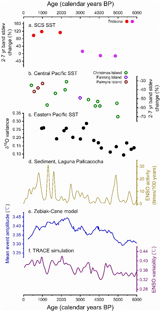为了进一步探讨中晚全新世的ENSO变率,本研究还集成了来自南海北部已发表的所有亚化石砗磲Sr/Ca序列。重建结果表明,从中全新世到晚全新世ENSO变率逐渐增加,这样的变化趋势也可以从一些古气候重建的ENSO变率中得到验证,如来自Laguna Pallcacocha drainage的沉积岩心,中太平洋集成的珊瑚δ18O序列及东太平洋有孔虫δ18O序列。此外,一些模式的模拟结果也预测了中晚全新世逐渐增强的ENSO变率,这可能是由于轨道变化引起的太阳辐射改变造成的。