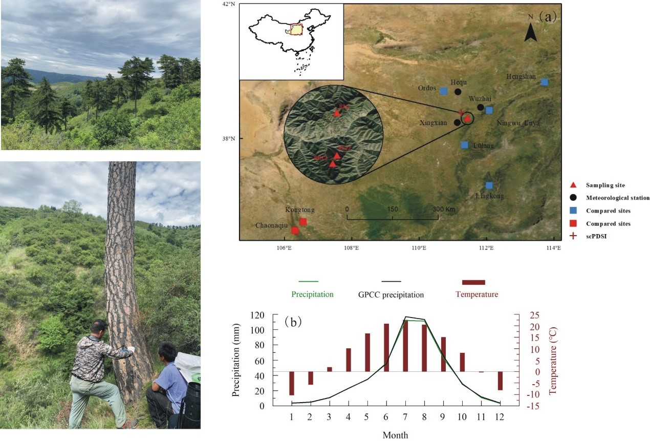 中国科学院地球环境研究所树木年轮研究课题组利用采自吕梁山中北部多地树轮宽度资料,重建了研究区1773-2020年上年8月到当年7月(水文年)的降水量变化历史。在过去近250年中,1910-1932年和1796-1806年分别为研究区最干旱和最湿润的时期;在十年尺度上,1920s和2010s分别为最干旱和最湿润的十年;在百年尺度上,19世纪相对湿润,而20世纪相对干旱。尽管20世纪下半叶研究区呈现明显的降水减少趋势,但是这一趋势已在2000s初期得到扭转,近十几年研究区逐渐变湿,2014-2020年是过去250年中的第二个最湿润时期。根据变化周期来看,未来几年降水可能还会持续增加;统计发现,黄土高原干旱更易发生在高温时期。