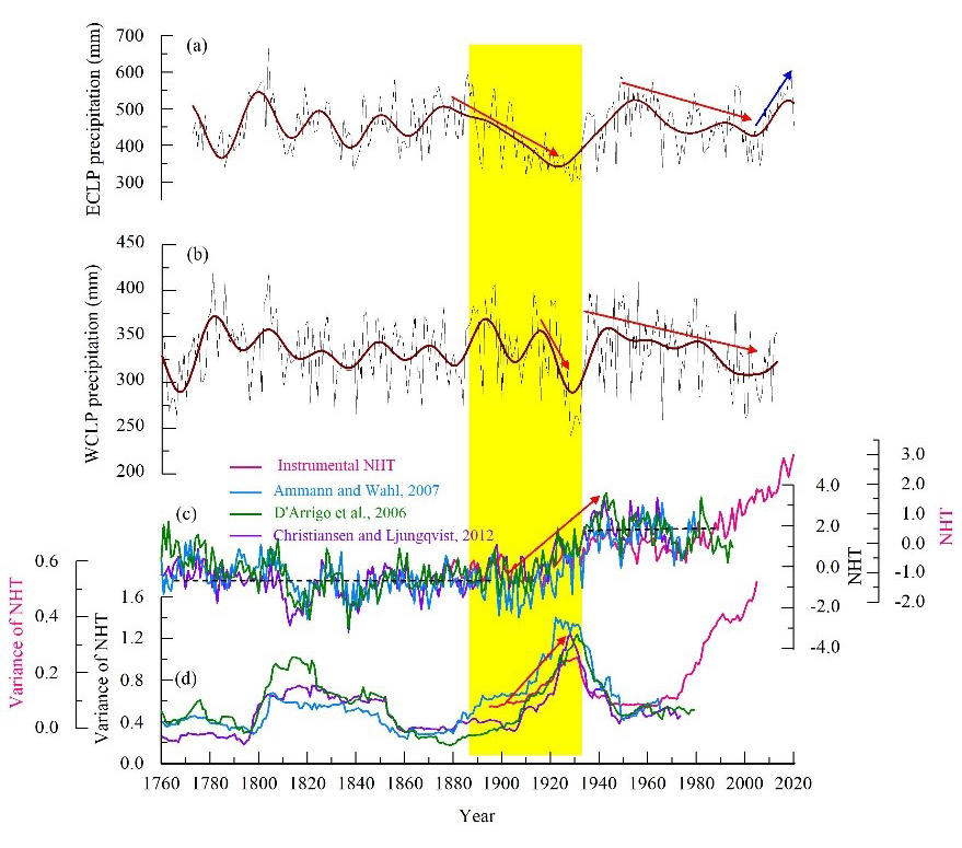 黄土高原降水变化除了受亚洲夏季风强弱及与之相关的大尺度环流(如NAO和PDO)变化的影响外,本研究的另一个重要发现是1920s末期广发于我国北方地区的干旱事件可能还与北半球温度平均态变化有关。