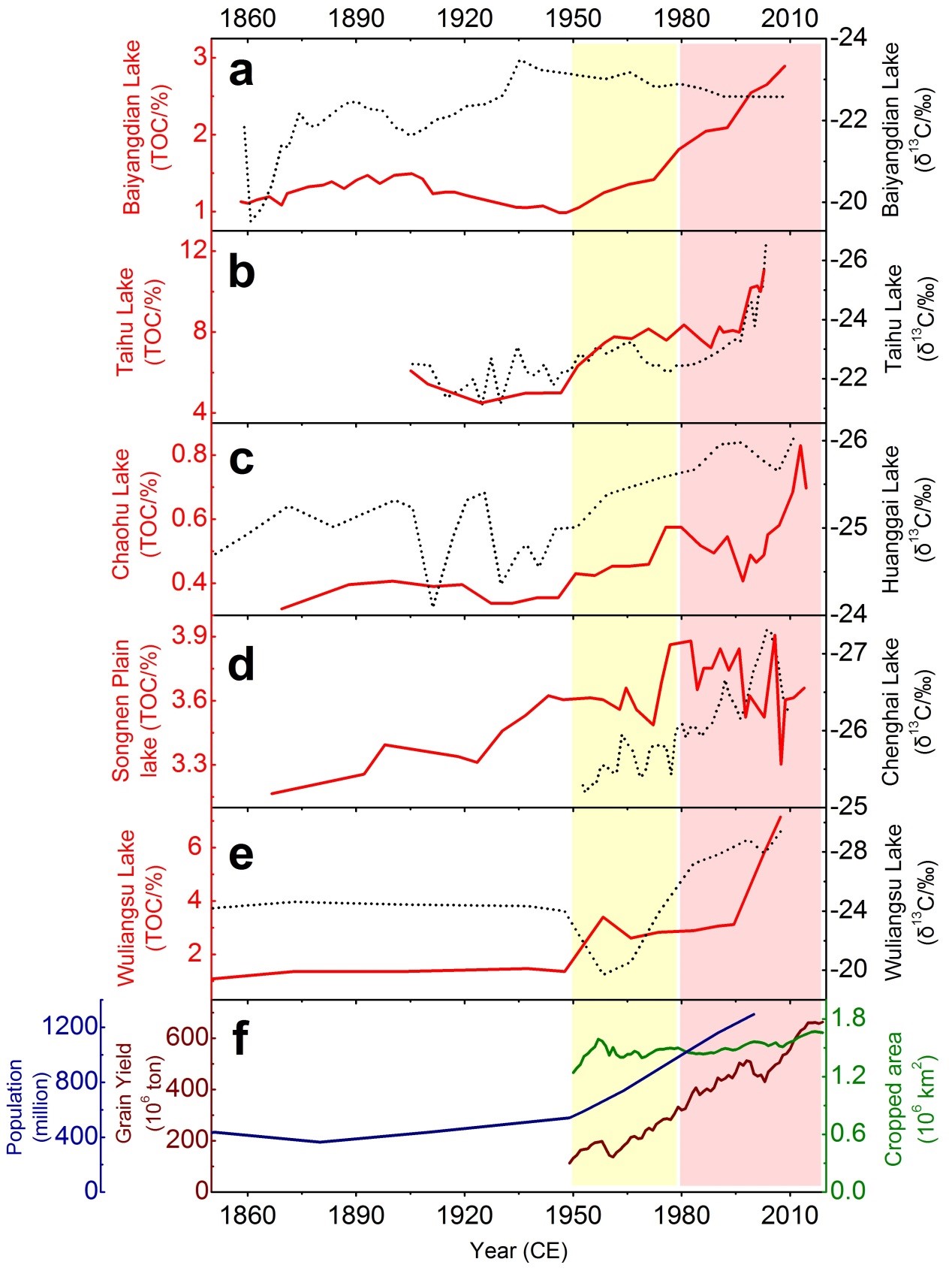 图3 部分样点的有机碳含量和有机碳同位素(可指示湖泊营养状况和碳循环动态)从1950 CE开始有明显变化(黄色区),1980 CE后变化加剧(红色区),核心区和边缘区的样点无明显差别。