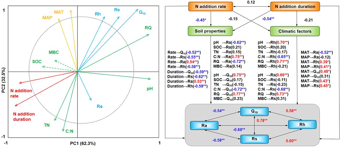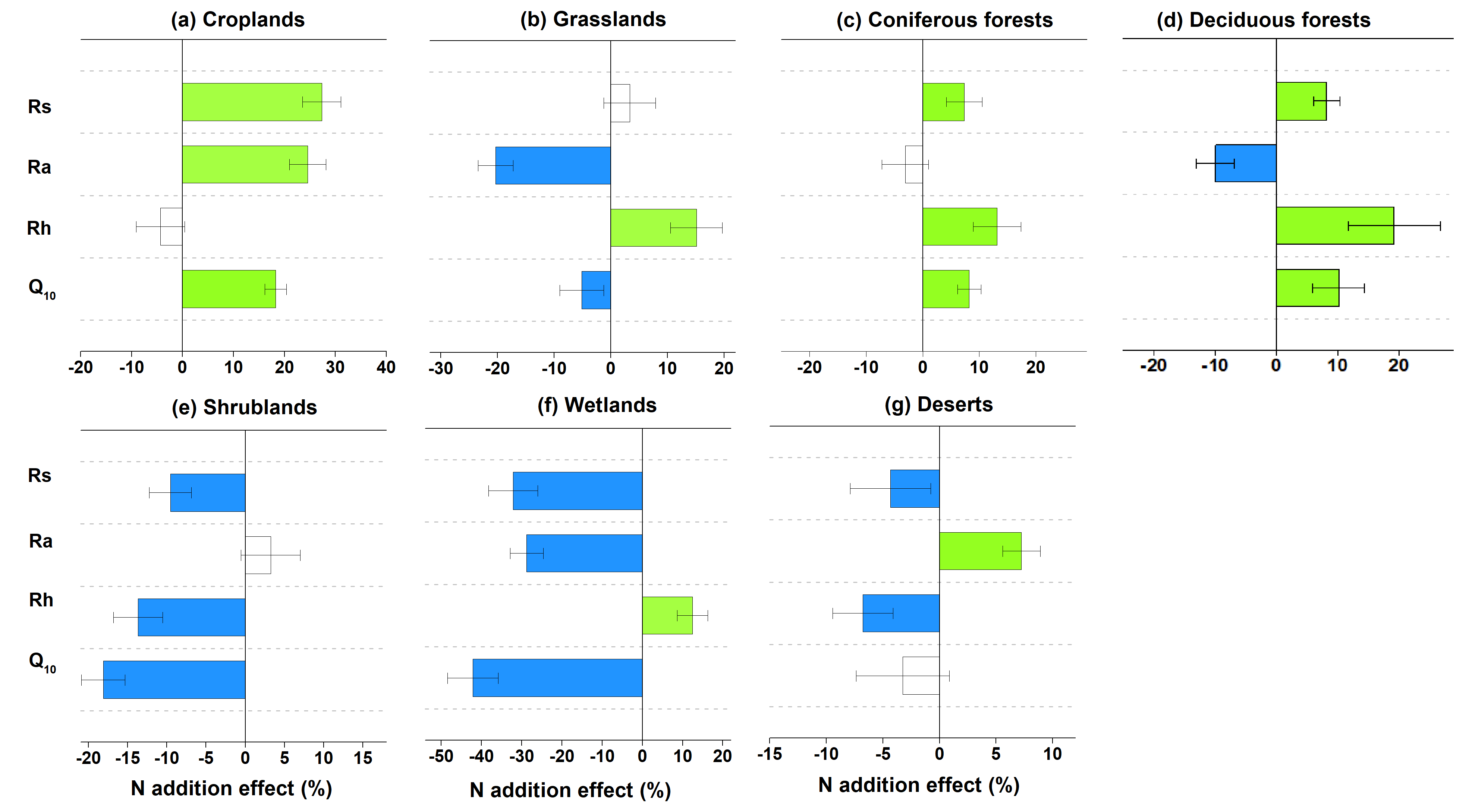 工业革命以来,化石燃料燃烧和农业化肥的施用导致大气氮沉降增加,对陆地生态系统碳循环产生了深刻影响。土壤呼吸(Rs)是陆地生态系统排放到大气二氧化碳(CO2)的最大通量,在全球碳循环中起着重要作用。土壤呼吸一般由两部分组成,一部分是异养呼吸(Rh),由土壤微生物分解有机物时所释放的CO2,另一部分是自养呼吸(Ra),主要包括活体根系呼吸所释放的CO2。在全球范围内,土壤呼吸通常随温度增加而增加,其响应强度用土壤呼吸温度敏感性(Q10)表示,即温度每增加10℃土壤呼吸所增加的倍数,能够反映出碳-气候反馈机制。因此,了解全球尺度下土壤呼吸及其温度敏感性对氮添加的响应将提高预测土壤碳动态及其对气候变化反馈能力。