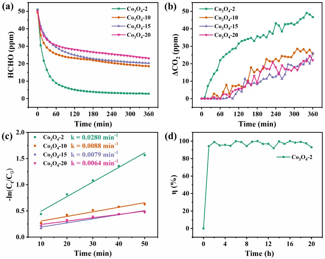 图2. 超薄二维Co3O4纳米片在室温下催化氧化HCHO性能