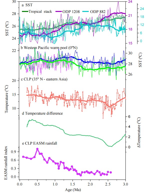 近日,中国科学院地球环境研究所刘卫国研究员团队联合美国布莱恩特大学杨洪教授以及香港大学柳中晖教授,通过生物标志物四醚膜脂定量重建了三百万年以来黄土高原连续的陆地古温度变化历史。研究发现,黄土高原地表温度在早中更新世出现了与目前人们从海洋温度记录看到的降温趋势不一致的现象(图1c,2.6Ma以来陆地温度呈现意想不到的变暖趋势)。研究者提出,早中更新世陆地的变暖增加了海陆热力对比,为该时期东亚夏季风增强提供了一个新的支持证据。