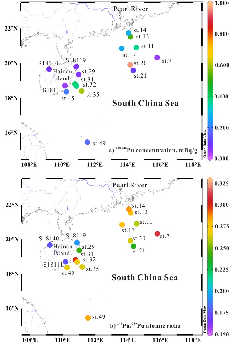 中国科学院地球环境研究所侯小琳研究团队基于高效的化学分离方法结合加速器质谱和电感耦合等离子质谱技术对129I、239Pu、240Pu进行了高精度分析,首次获得了南海西部海水和西北部表层沉积物中碘和钚同位素的空间分布(图1和图2)。研究结果表明:研究区海水中129I主要源于核武器试验的全球沉降和欧洲核燃料后处理厂排放经西风带和东亚冬季风的远距离运输,处于全球沉降本底水平;沉积物中的239,240Pu主要来自于全球大气沉降和太平洋核试验场(PPG),基于经典两端元混合模型估算,PPG近源沉降的钚对南海西北部表层沉积物中钚的相对贡献为39%-78%(均值59%)。