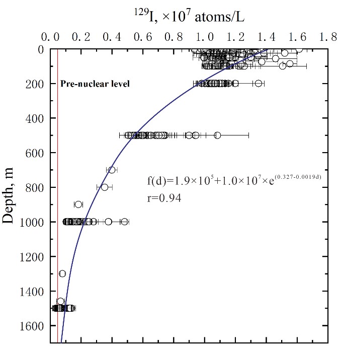 研究结果揭示大气沉降在湄公河流域的129I经河流输入是研究区内除海洋直接大气沉降之外的重要129I来源。精细化三维空间分布表明来自湄公河的高129I水团在表层(2-25m)的北南沙海流的作用下,在11°N向东移动。垂向剖面上,129I水平随深度增加呈指数下降(图3),首次揭示了水溶性放射性核素129I从上层(2-500m)到中层(500-1500m)海水主要通过缓慢扩散作用传输,同时阐明了至少在过去70年内,南海西部1500m水深的海水未明显受到上层海水的污染。