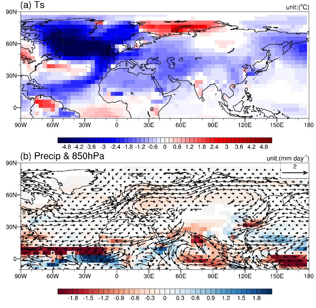 图1.新仙女木时期TraCE 21ka全强迫模拟中(a)地表温度和(b)夏季降水(填色)及850hPa 风场(矢量箭头)的变化。