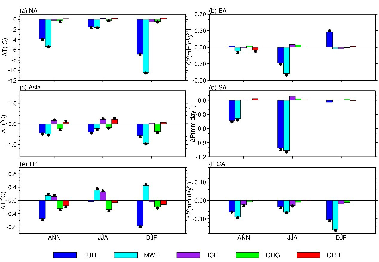 图2.新仙女木时期TraCE 21ka全强迫及各单因子强迫模拟中各典型区域地表温度和降水的相对贡献。